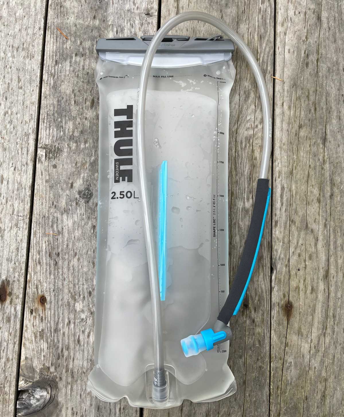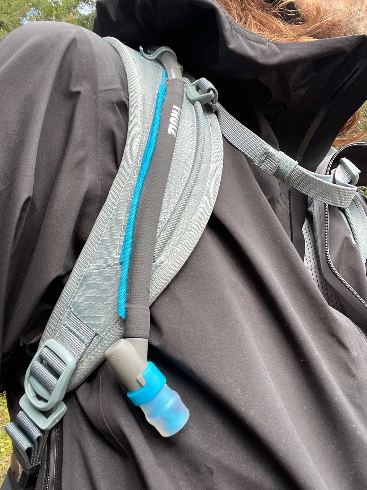 This pack features Thule’s 2.5L bladder, which has a baffle inside to reduce movement from the water. The bladder’s slide-on top closure makes for easy filling and secure closing, and the mouthpiece has a lock-off. The AllTrail 10L includes a fabric loop to hold the bladder upright inside the pack.
