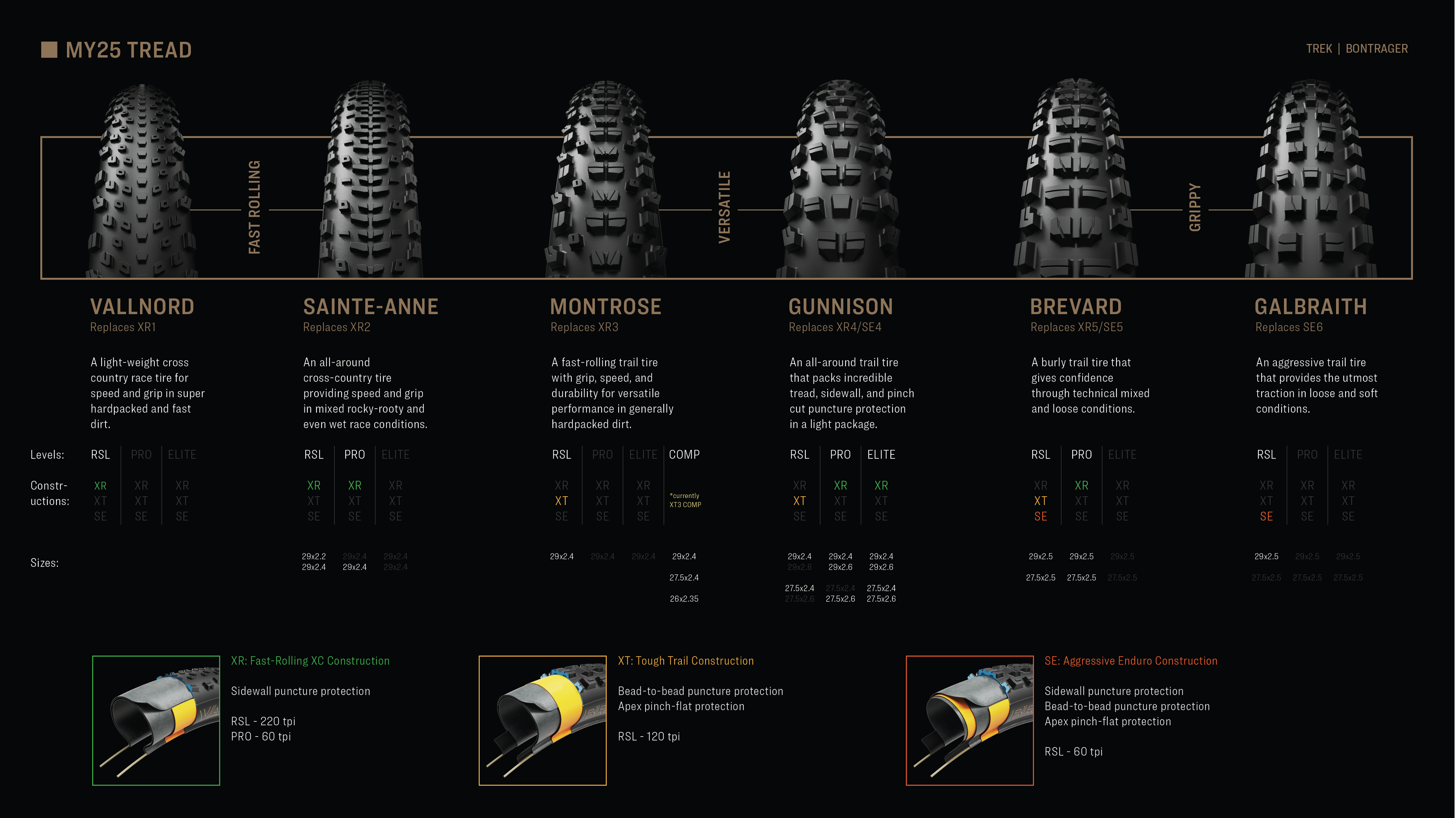 Both tires are also offered in Bontrager’s new RSL SE construction which uses a 60TPI casing with sidewall, bead-to-bead, and apex puncture protection. This is the only casing offered for the Galbraith, but the Brevard also comes in XR and XT. According to Trek’s testing, the new SE casing improved pinch-flat resistance by an impressive 33% on the Brevard compared to the SE5, while the Galbraith improved by 26% from the SE6.
