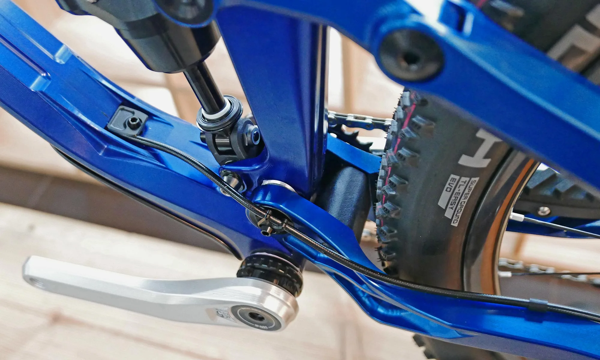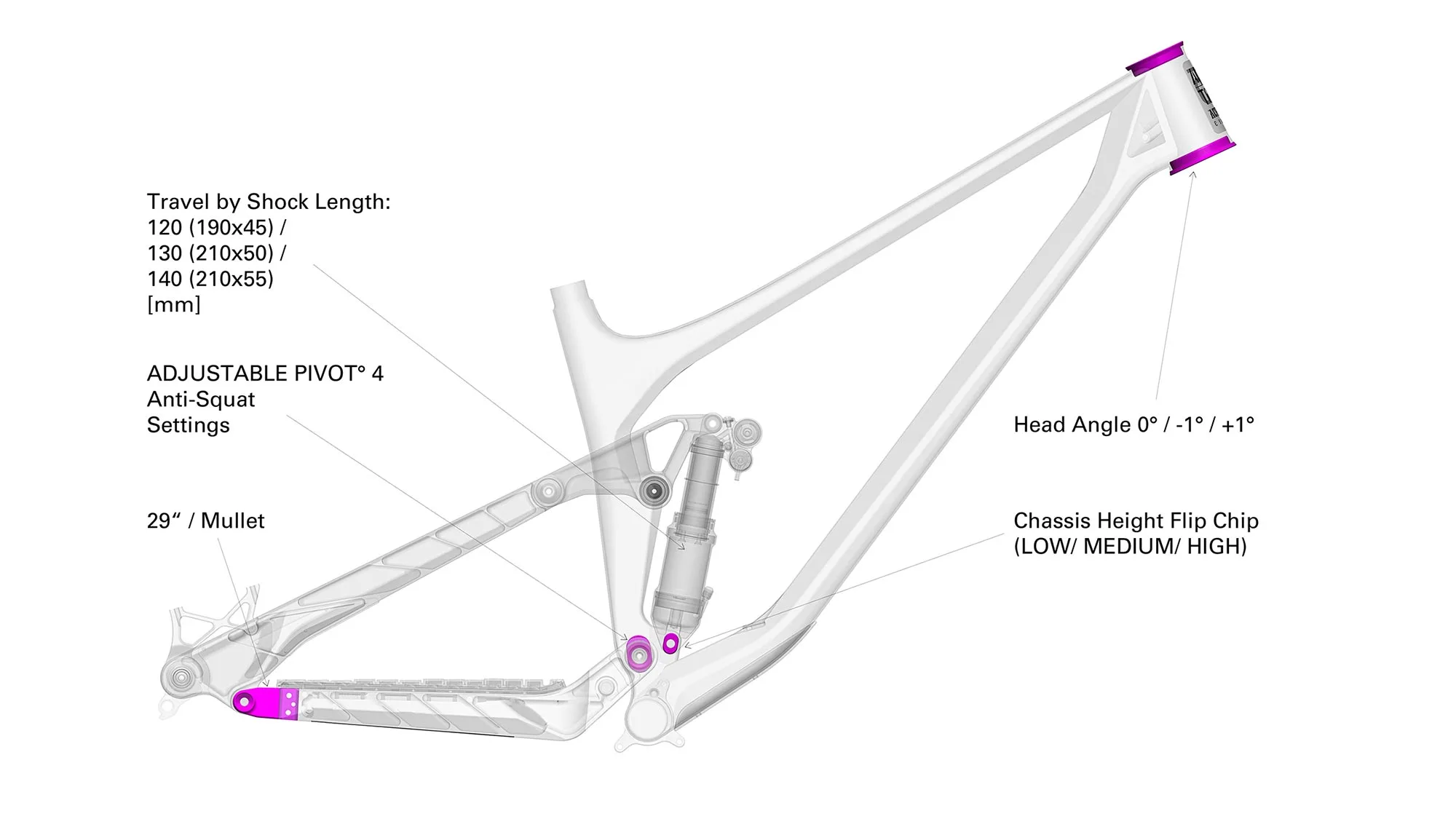 - 120, 130, or 140mm of 4-bar rear wheel travel via different shock stroke (190×45 or 210×50/55mm)