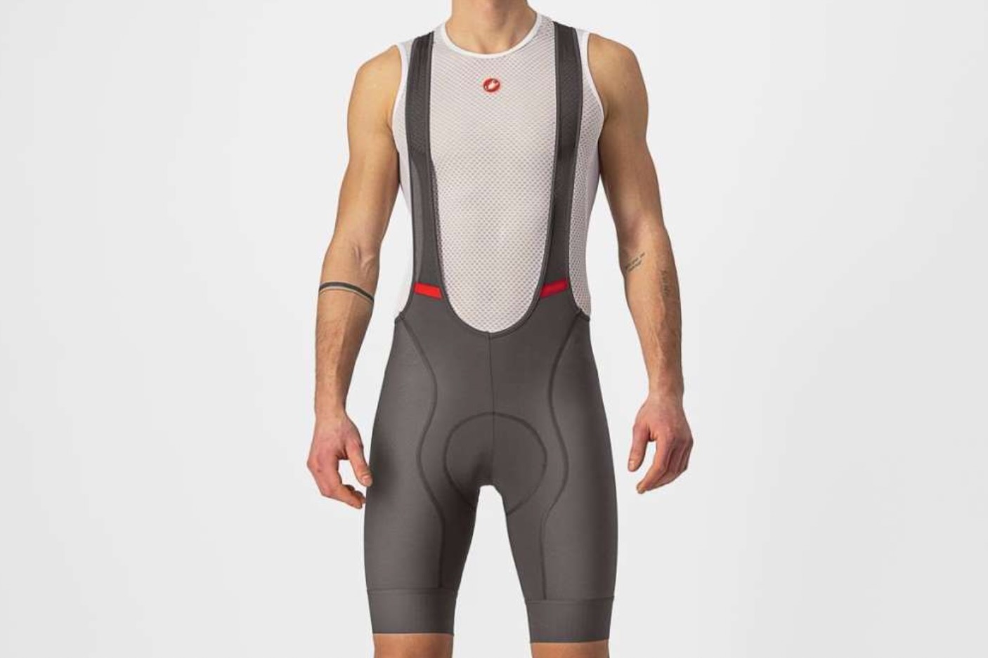 Grippers on the legs of bib shorts prevent the shorts from sliding up the rider’s quadriceps. Well-executed grippers achieve this without generating excessive friction on the skin or impeding the stretch of the short’s material in accommodating the motion of pedaling. Many bib shorts, like the Castelli Free Aero RC and the Castelli Endurance 3, forego grippers altogether, by using lycra panels in the lower leg that generate grip by way of compression alone. Since the quadriceps expand and contract dramatically during each pedal stroke, grippers do affect fit at the opening of the leg. In a perfectly fitting bib short with the best gripper style for you, there should be no visible gaps between the bib short opening and your leg throughout your pedaling motion.