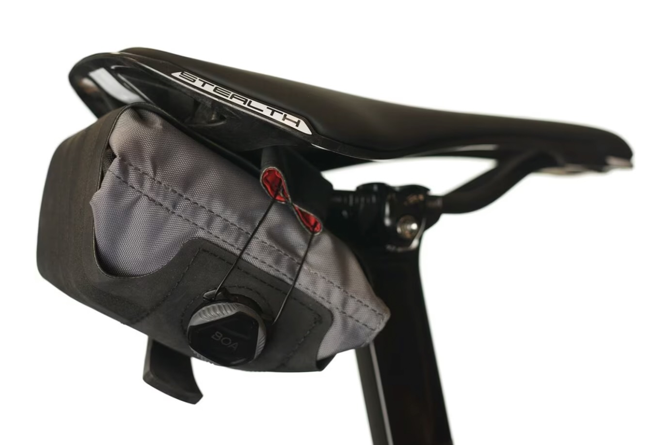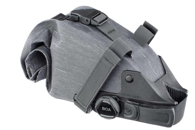 A few bags use a Boa strap to attach them to the bike. The two models we tested with this system are the Mattone Seat Pack and the Seat Roll Asymmetrico, both made by Silca. In both cases, a wide strap wraps around the pack and seat rails where it is joined and tightened with a Boa dial and thin wire. We’ve found this type of attachment to work relatively well, especially on the Mattone. The EVOC Seat Pack Boa also uses a Boa, but in this case, it secures the pack around the seatpost.