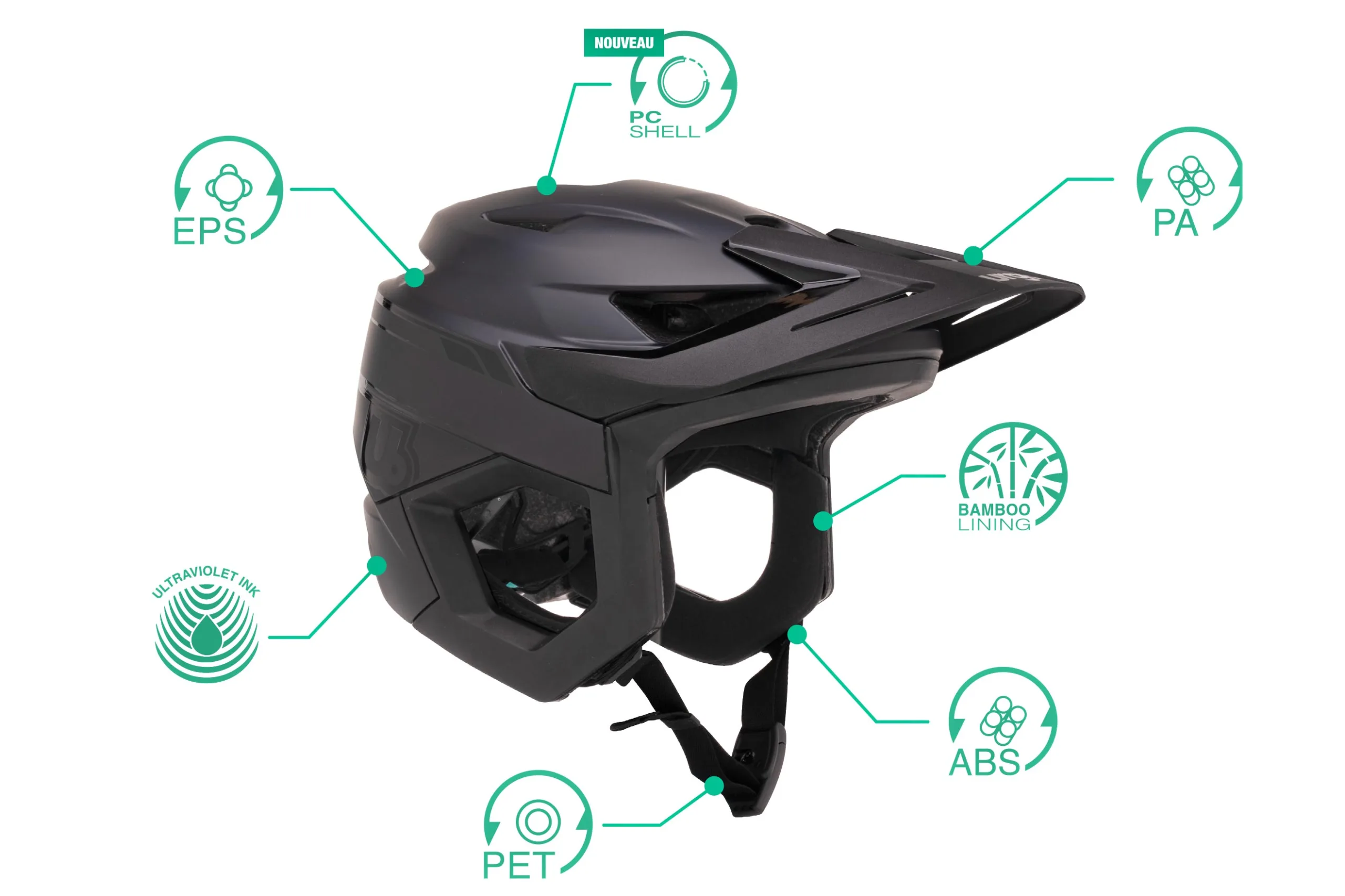Besides its shell, all colors of the Urge Rascas mountain bike helmet feature post-industrial recovered EPS foam, recycled polyamide visors, recycled ABS for its plastic hardware, recycled PET for the straps, and rapidly renewable bamboo lining pads.